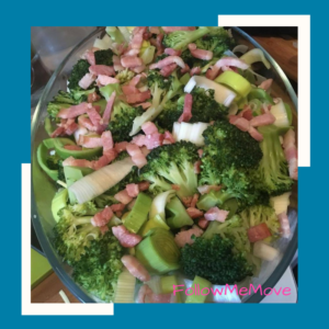 7. Een deel spekjes meng je tussen de groentes. De rest gaat bovenop.